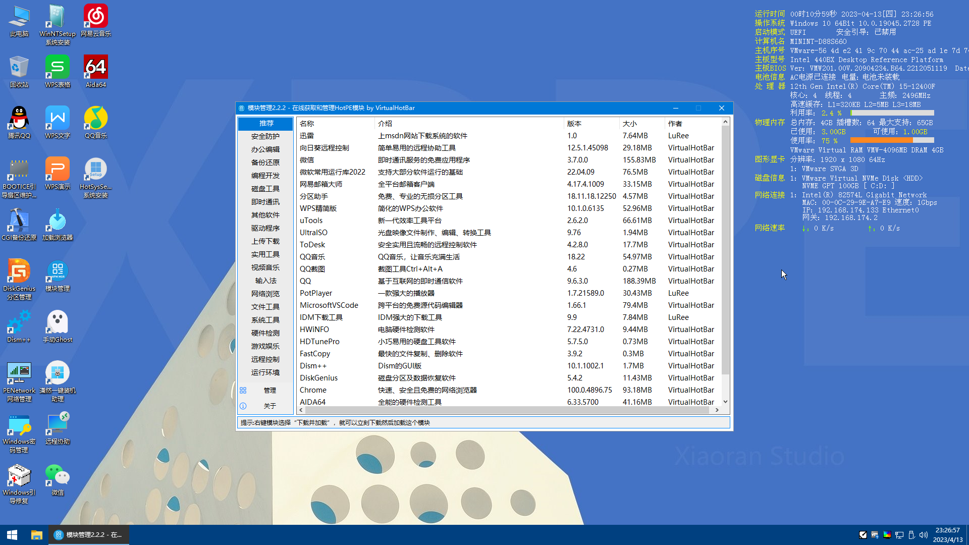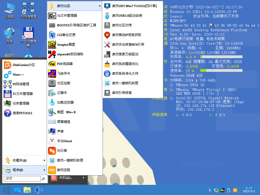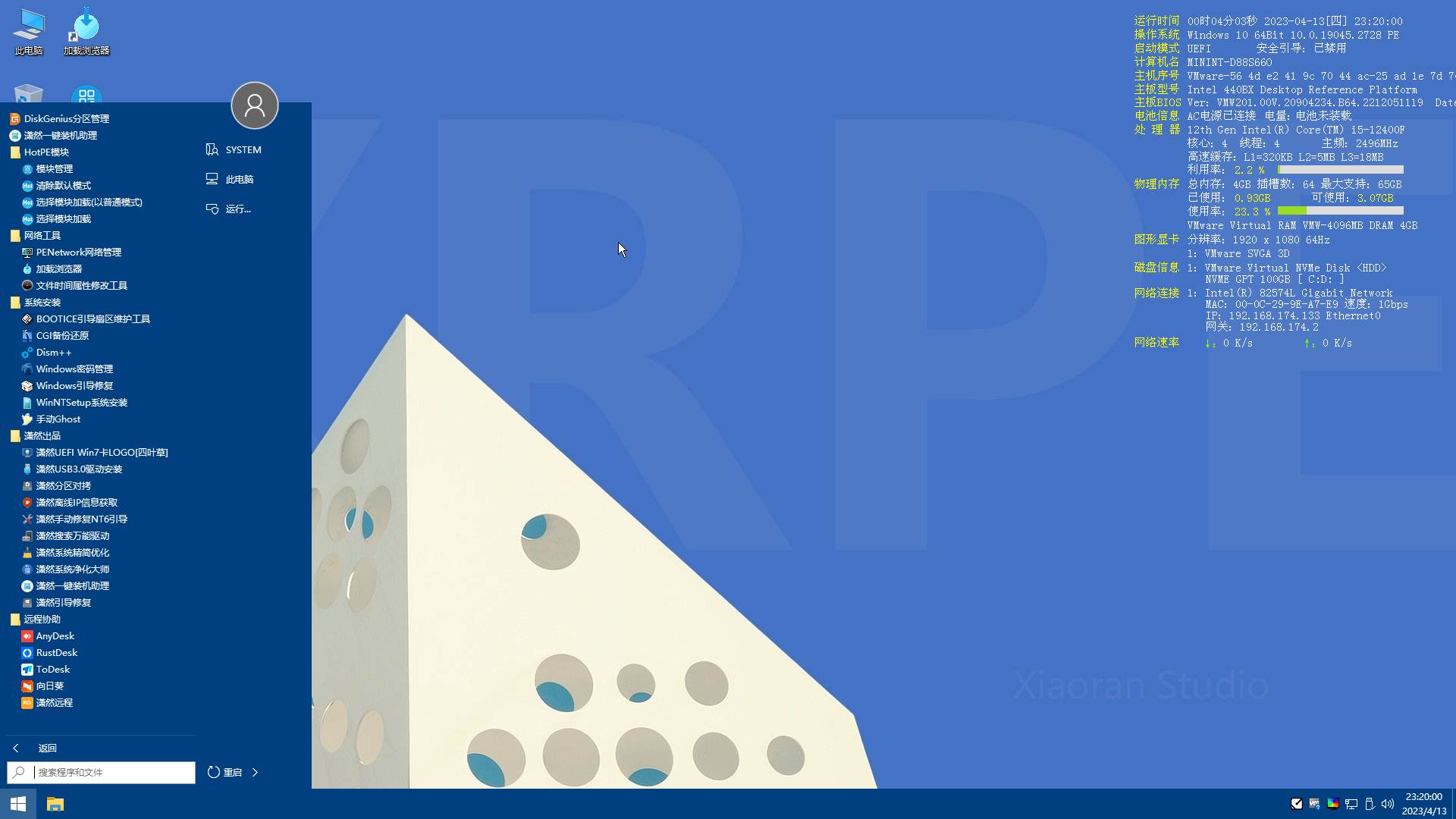 修改自@2013koko,补全了部分组件,支持使用远程,不支持TV;使用@Lightning的工具加载了提取自USBOS的系统驱动,支持服务器阵列卡、笔记本等设备读取硬盘,支持Win10下免驱的声卡,支持自动连接WiFi;支持自动安装VMTools;支持软件从快捷方式、潇然一键装机助理、HotPE模块管理在线下载安装